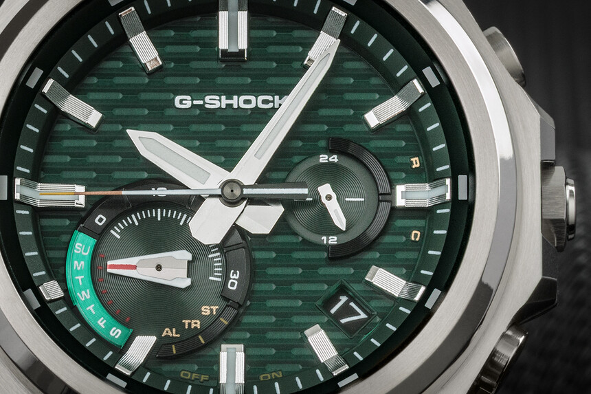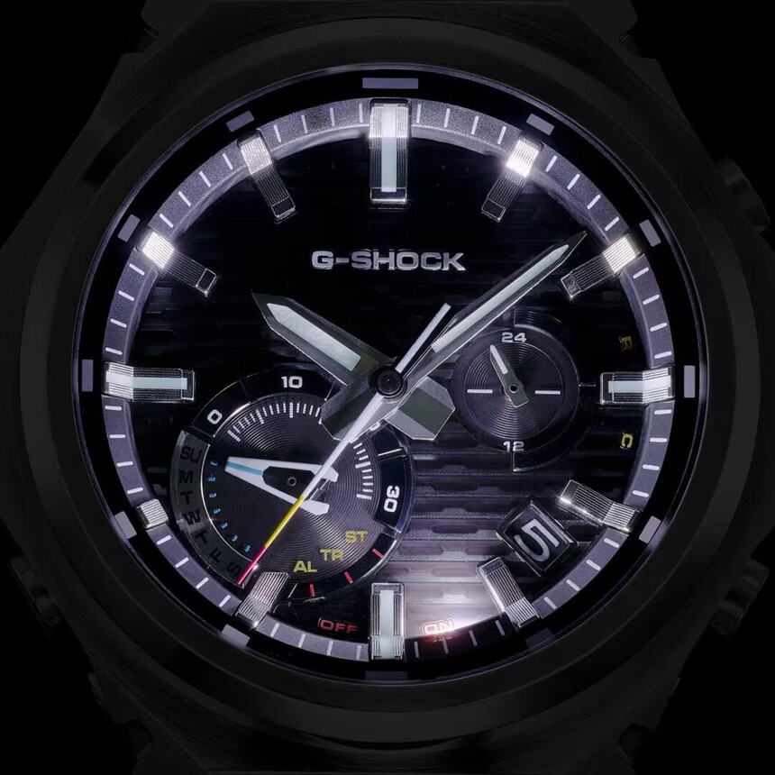 Le minimalisme du cadran est légèrement dynamisé par deux sous-cadrans, et conceptuellement cela a du sens. Sans eux, ce ne serait pas une G-Shock. Le sous-cadran en bas à gauche sert d’indicateur de mode. Celui de droite fait office d’indication AM/PM (matin/après-midi). Les sous-cadrans, eux, sont bien visibles. Ce que l’on ne voit pas, en revanche, c’est la cellule solaire dissimulée sous le cadran, qui capte la lumière et assure une marche longue et quasi sans souci.
