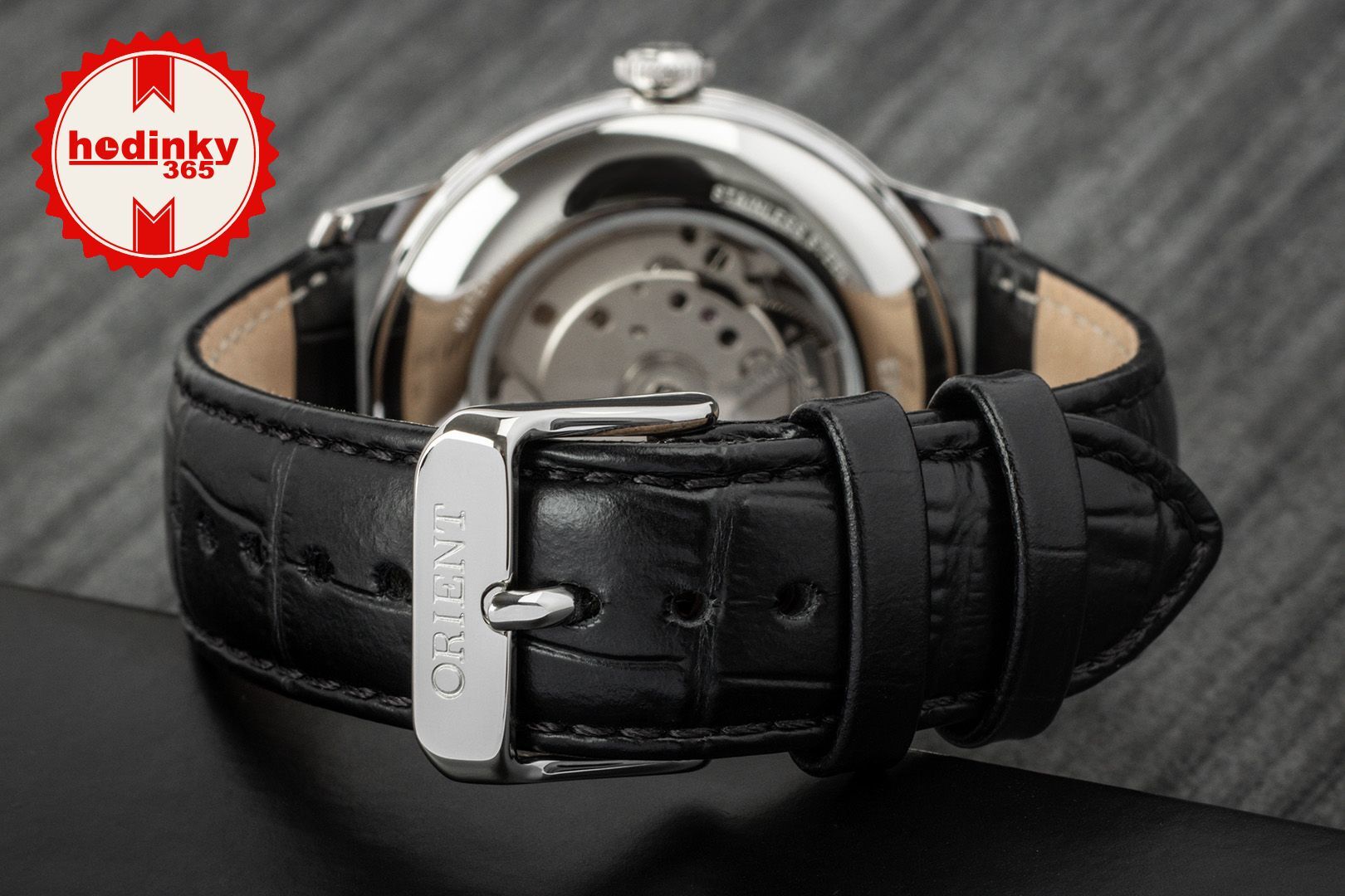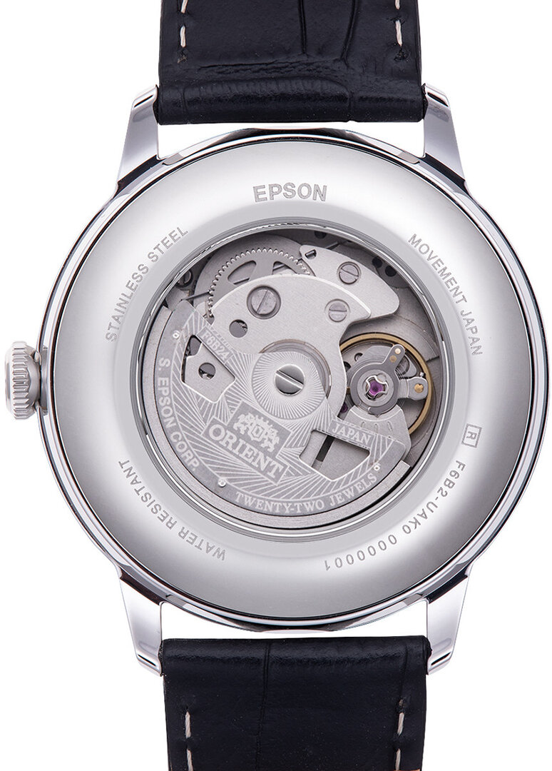 Mécanique avec remontage automatique. Orient F6B24, Réserve de fonctionnement 40h, 21.600 BPH (3Hz), 22 pierres, Piratage, Possibilité de remontage manuel, Remontage double face