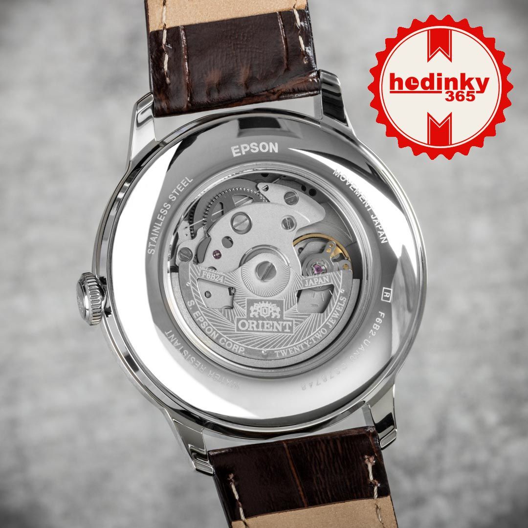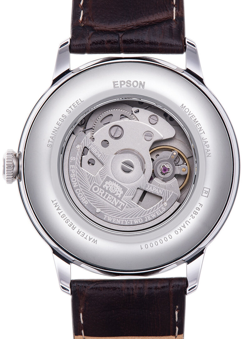Mécanique avec remontage automatique. Orient F6B24, Réserve de fonctionnement 40h, 21.600 BPH (3Hz), 22 pierres, Piratage, Possibilité de remontage manuel, Remontage double face